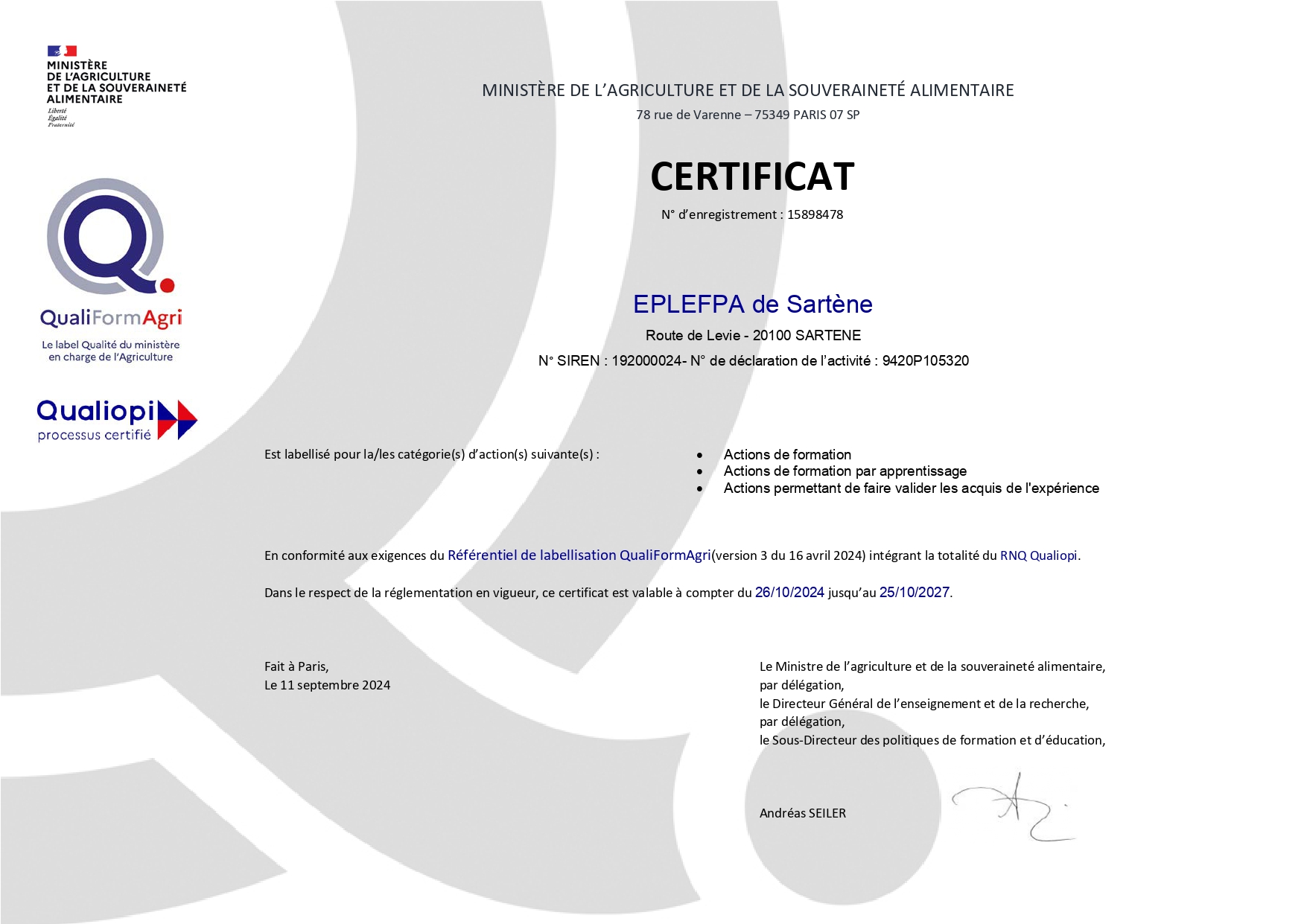C’est dans ce contexte que le Campus AgriCorsica répond aux exigences des référentiels Qualiopi et QualiFormAgri depuis 2019 et qu’en 2024, il a obtenu la labellisation QualiFormAgri.